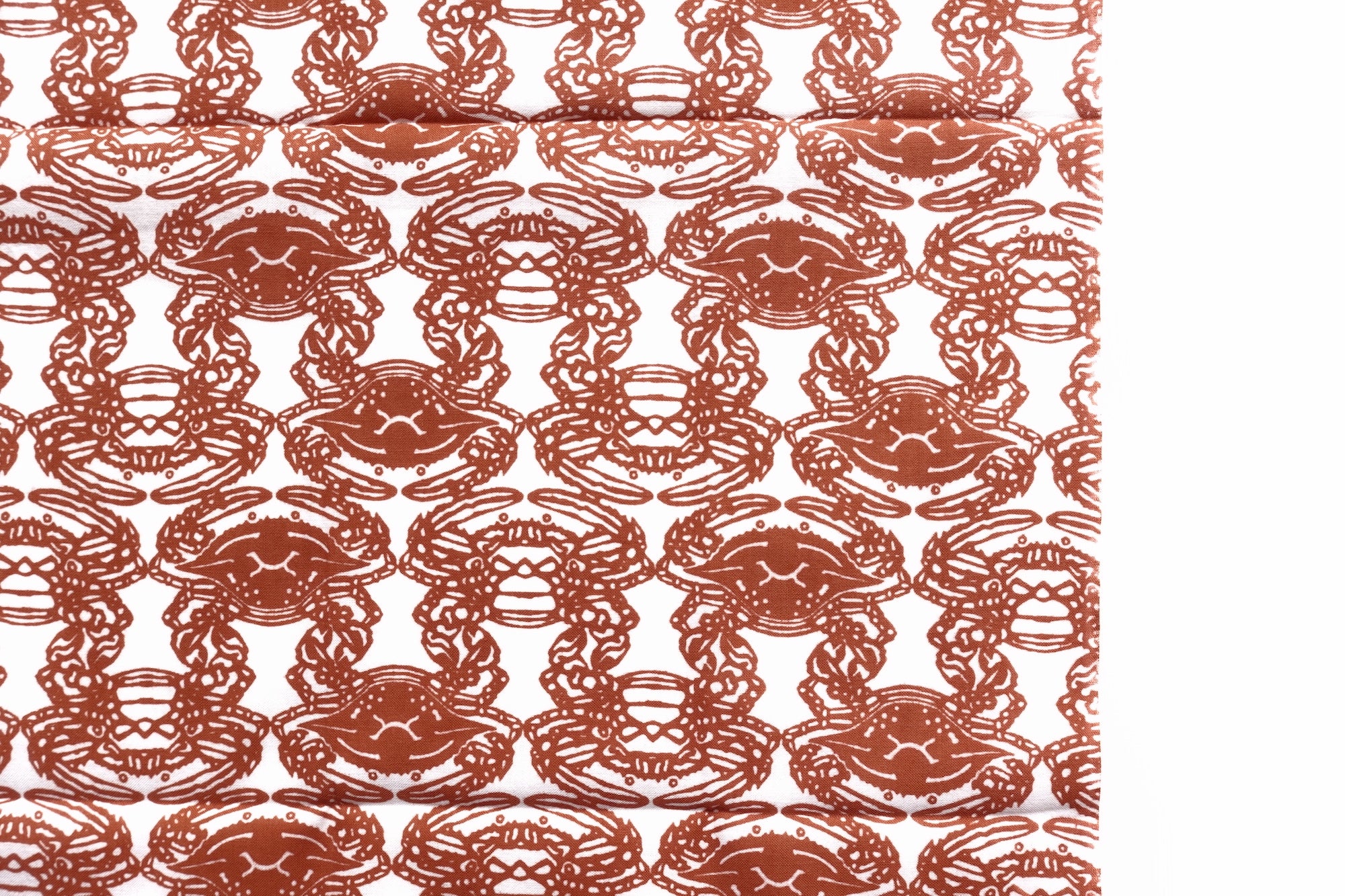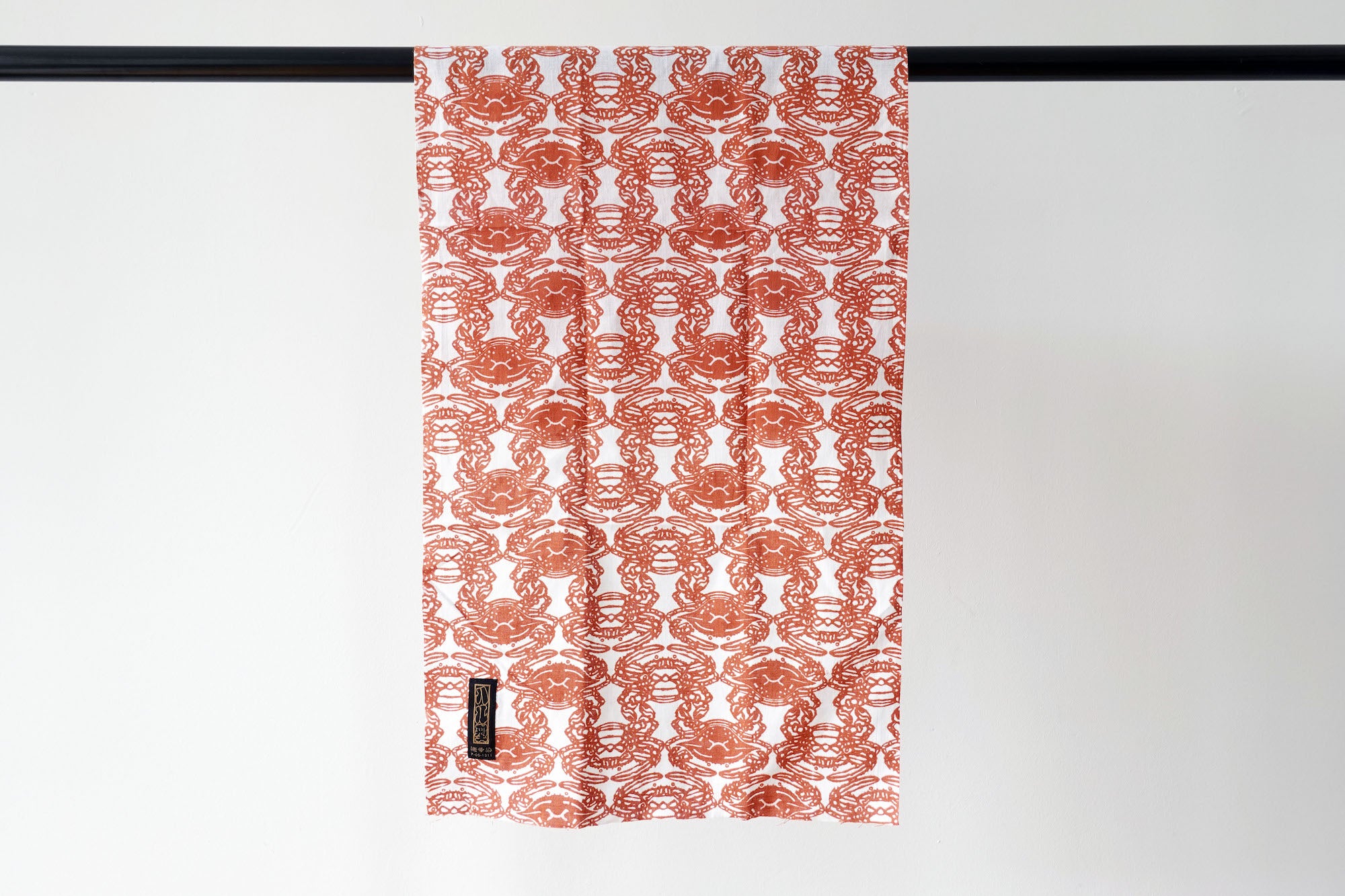A tenugui printed with a crab motif, made from Izumimomen cotton—a weaving tradition from the Izumi region valued for its softness and absorbency. Tenugui have served as hand towels, wrapping cloths, and decorative textiles in Japan for centuries.
