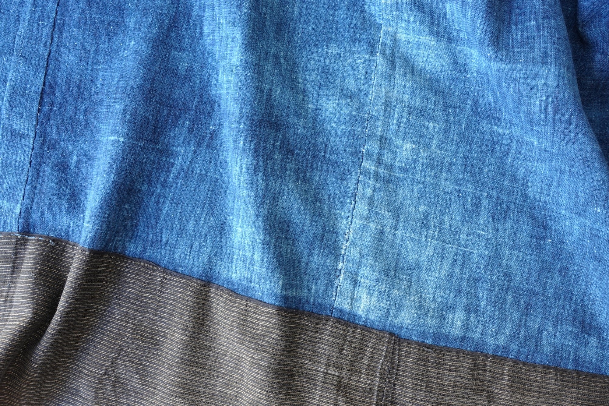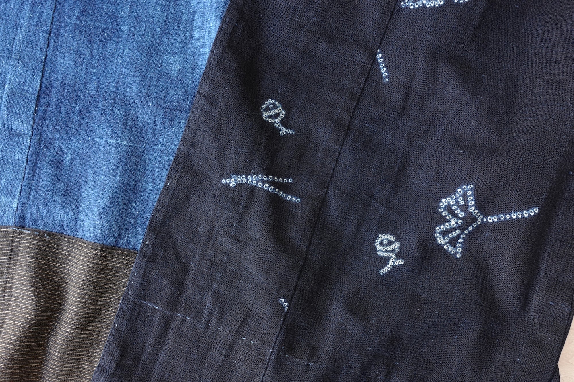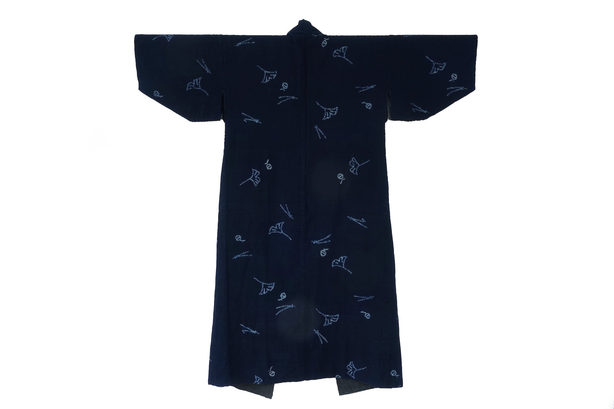 A "noragi" — an everyday work kimono or jacket from around 1900. This piece from the Akita region features the local craft of "shibori" — hand-stitched tie-dye patterns of ginkgo leaves, nuts, and pine needles whimsically decorating the exterior. The interior is lined with beautifully faded indigo fabrics. In great overall condition — a very rare and collectible piece.