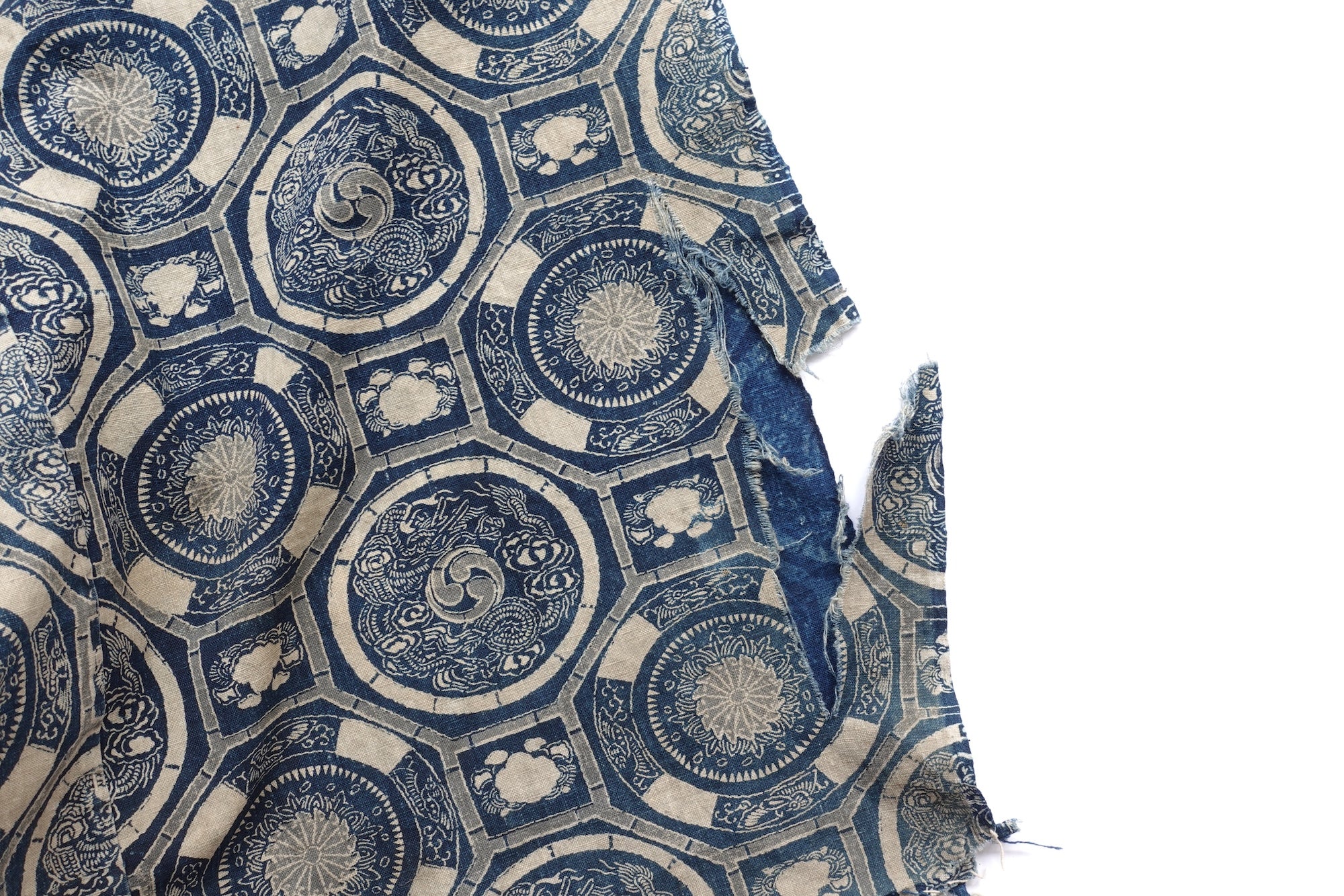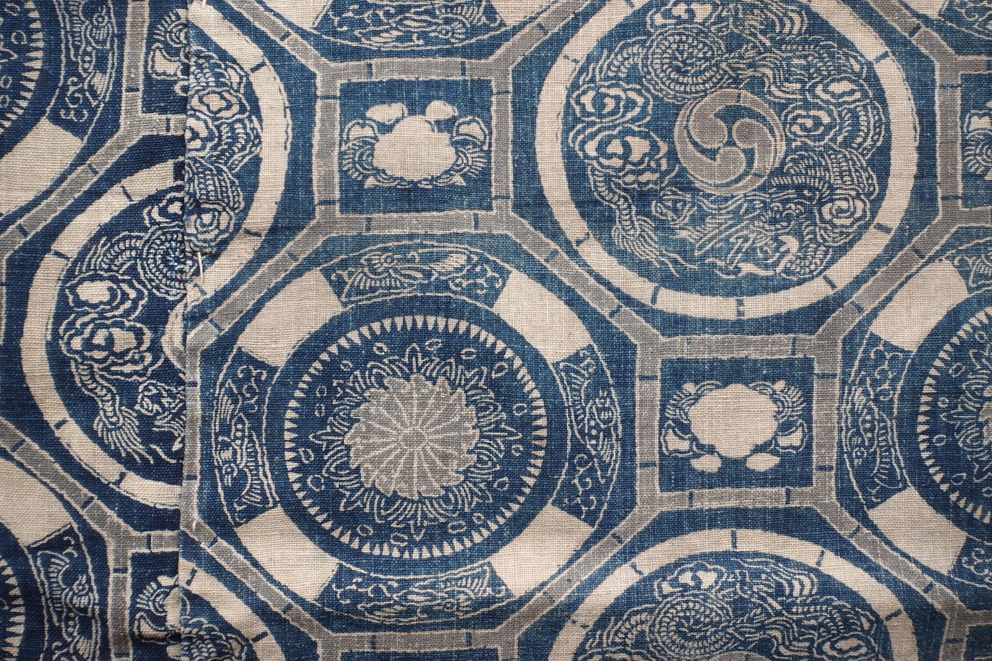 A four-panel textile dating to circa 1900, featuring richly layered motifs of dragons, florals, and traditional symbols rendered through the meticulous katazome stencil-dyeing technique in deep indigo and sumi ink. A rare surviving example of early 20th-century Japanese craft, ideal as a striking decorative accent for the home.