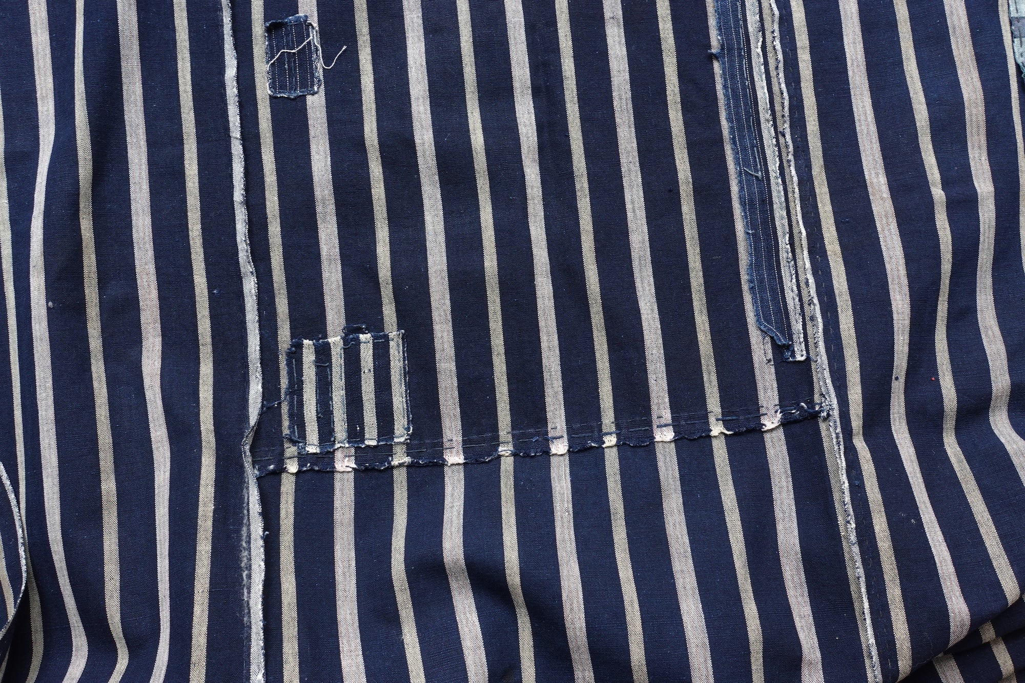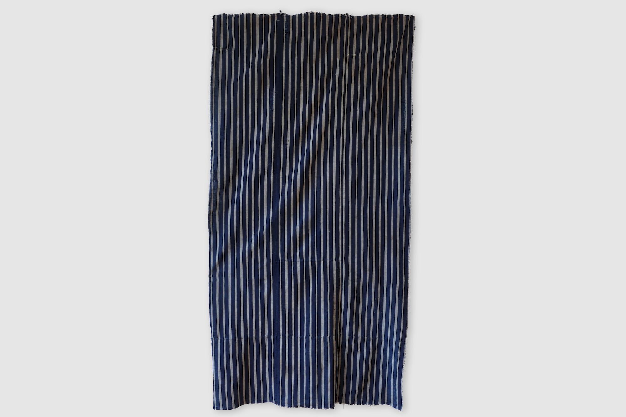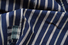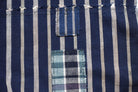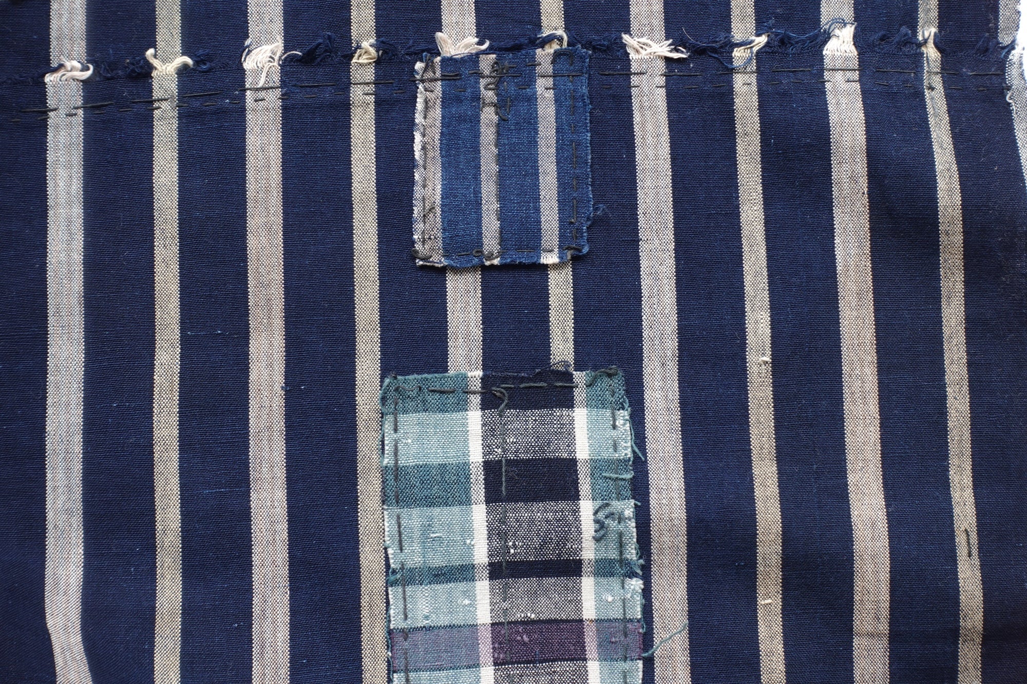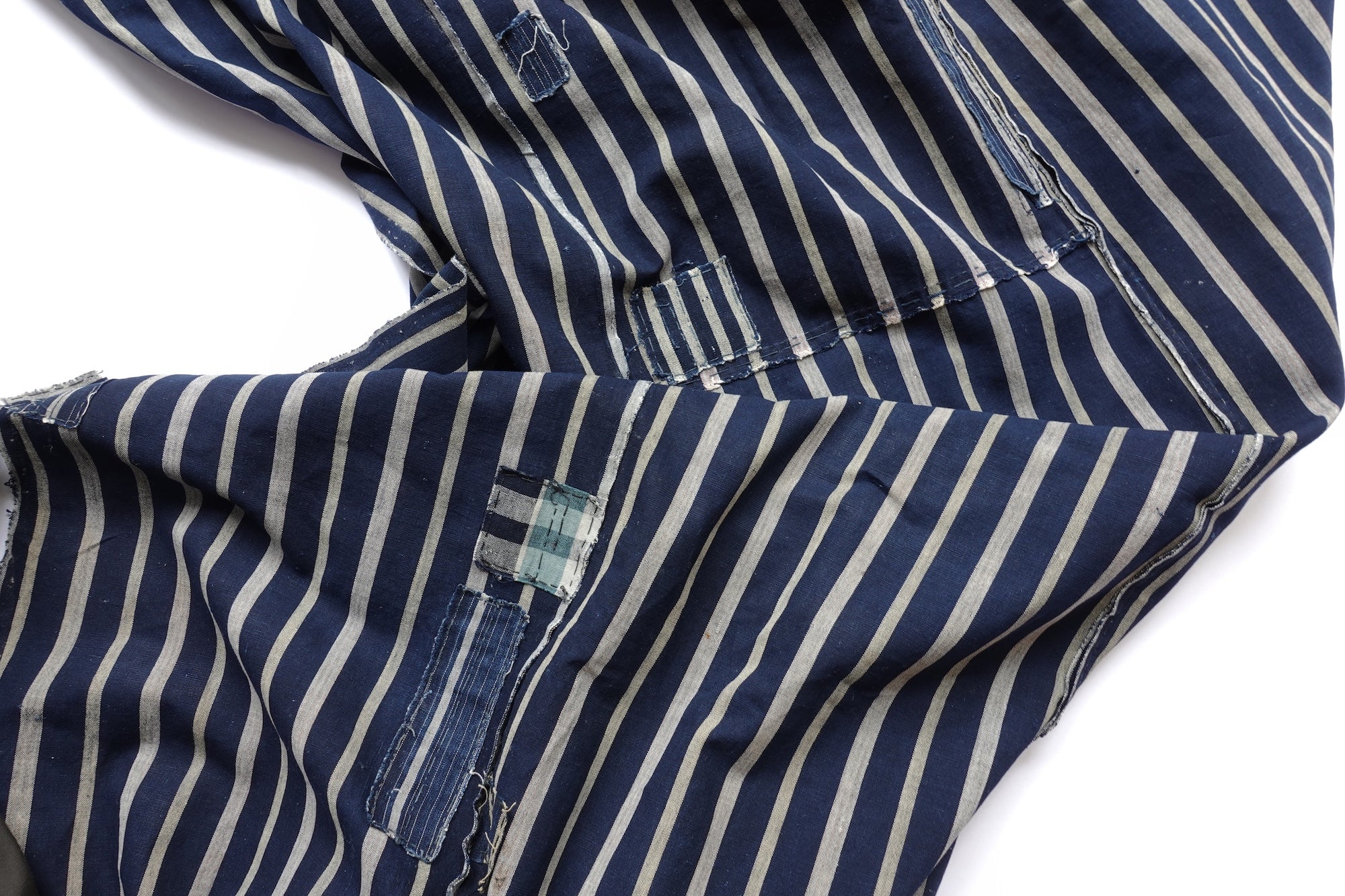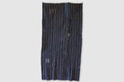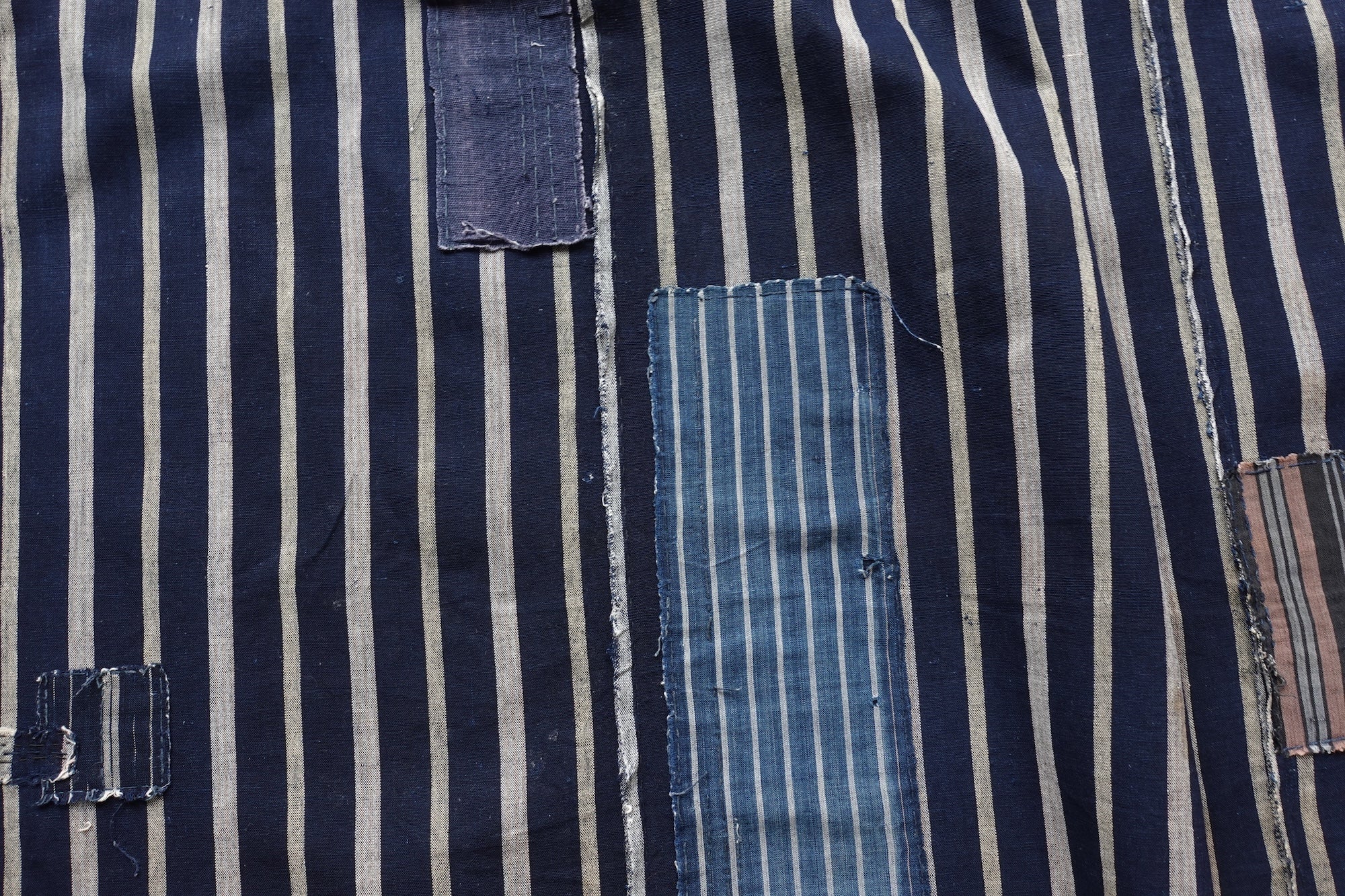A vintage fabric featuring a modern stripe pattern in deep indigo and grey, with rhythmic patches throughout. A striking accent piece for a wall, bed, or sofa.
