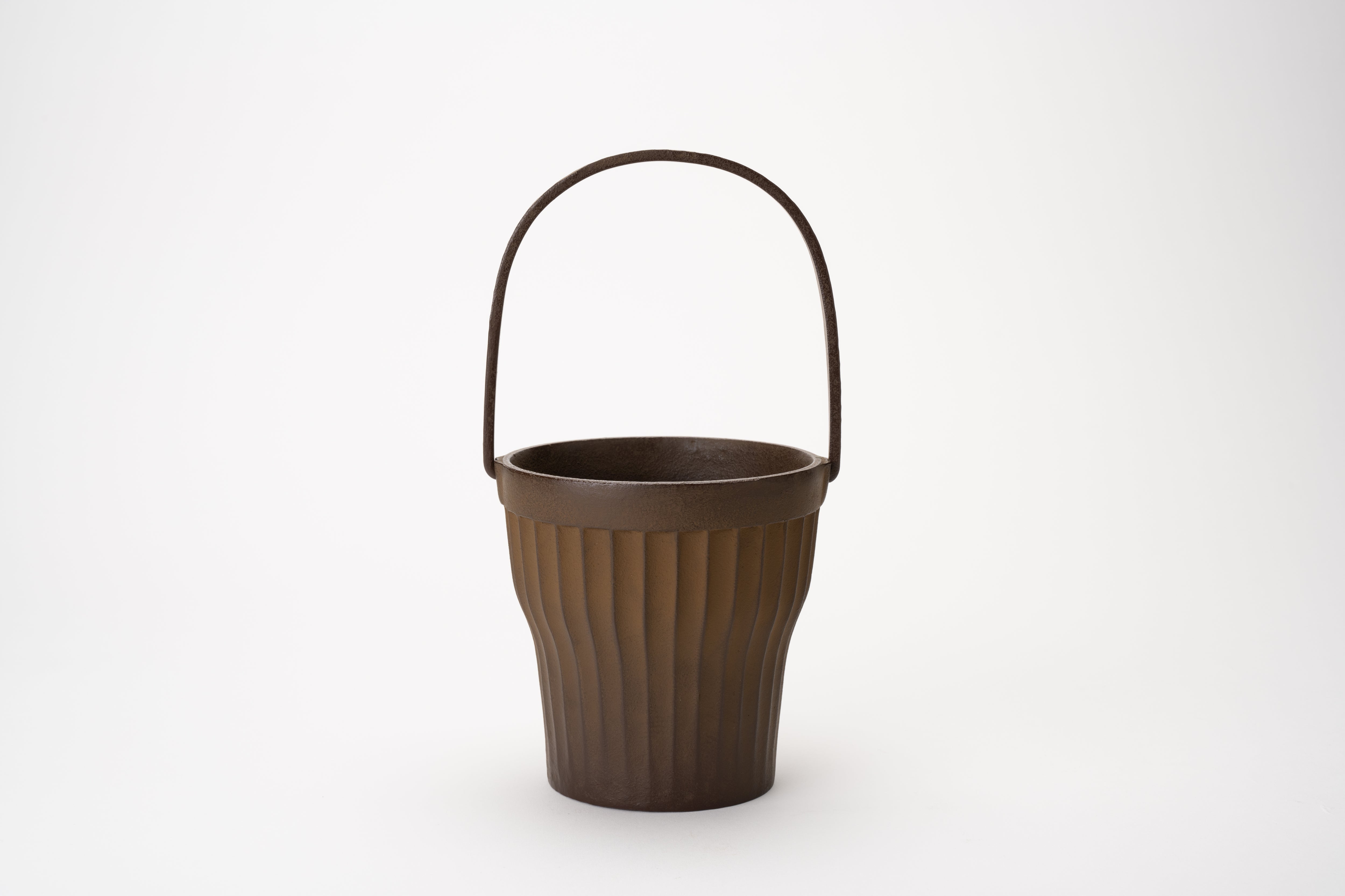 Shaped like a mug and fitted with a forged iron handle at its side, this vase has the quiet solidity of something designed to last without fuss. Vertical striped lines run the length of the body, lending a subtle rhythm to its surface.